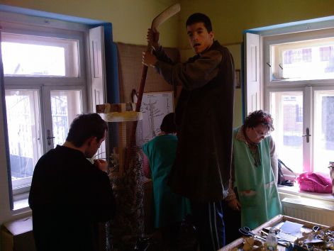 Hogy a másik csapat se maradjon le . Tomi a hokiütőmmel tunkolja a sárkány száját.